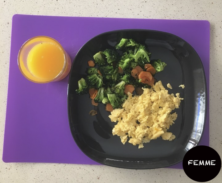 Brócolos e cenoura salteados com ovos mexidos, acompanhado de um belo sumo de laranja